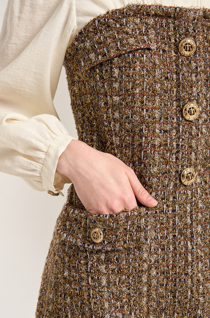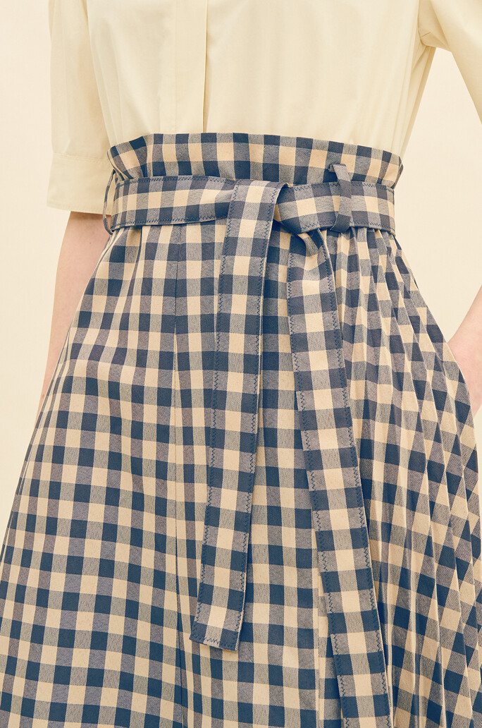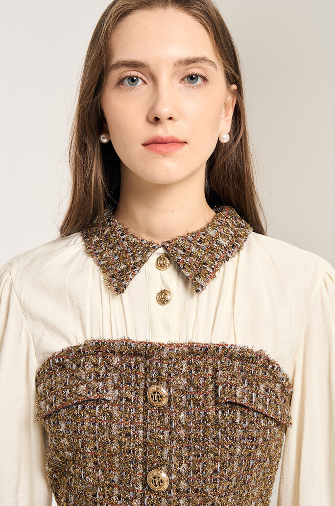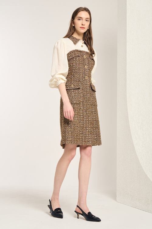 벨티드 콤보 드레스 서로 다른 텍스처가 조화를 이루어 탑과 스커트를 매치해서 입은 듯한 느낌의 원피스입니다.