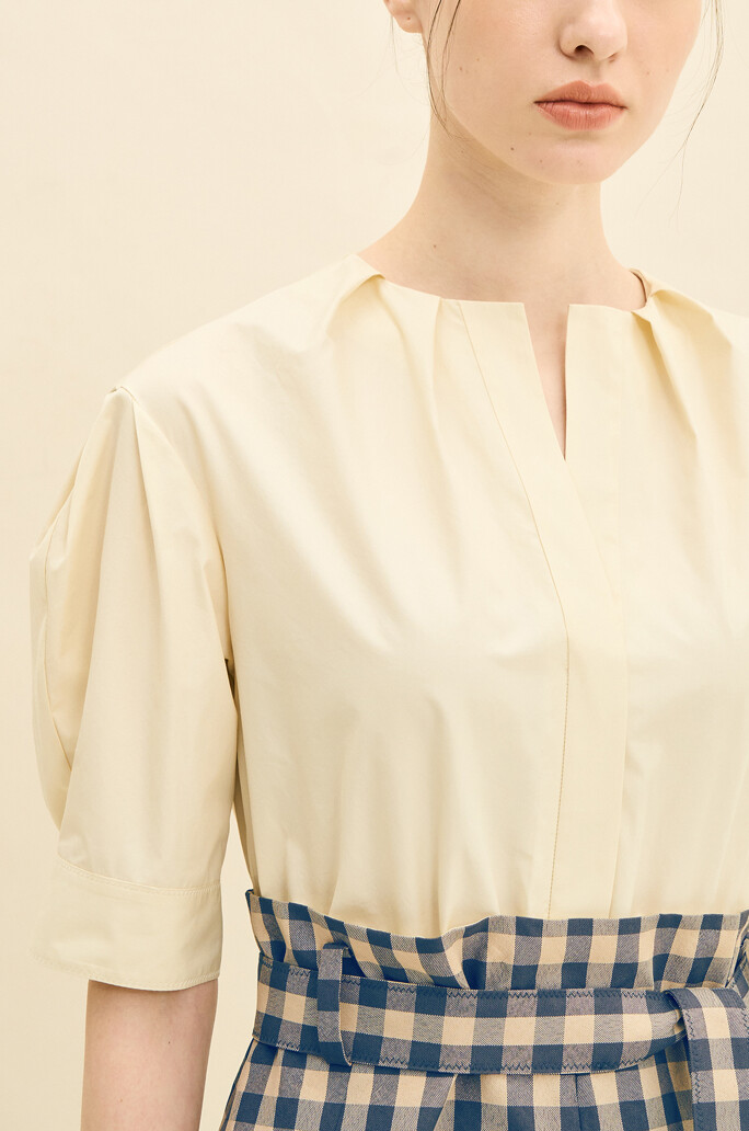 소매 부분을 포인트로 스트랩으로 고정을 하면 봉긋한 퍼프 소매가 되며 포인트 주지 않으면 긴팔처럼 입을 수 있는 장점이 있습니다. 단순한 포인트로 두벌의 옷의 느낌 너무 좋은 거 같습니다.