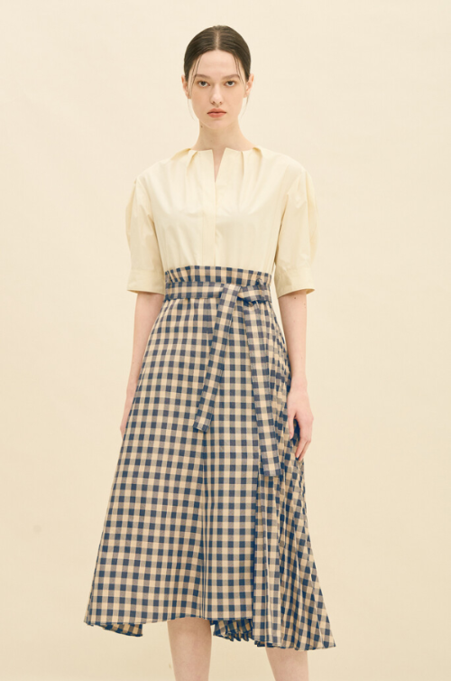 벨티드 콤보 드레스 원피스는 포인트 벨트가 슬림한 라인을 연출하며 넥라인포인트와 퍼프소매의 디자인이 멋스럽습니다.