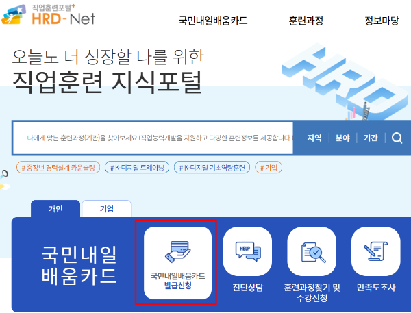여기에서 국민일배움카드 발급 신청 할수 있습니다.