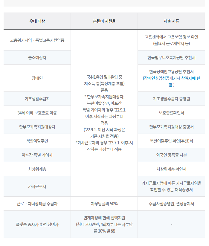 밑으로 더내려 보면 우대대상 훈련비 지원율 제출 서류에 대한 자세한 안내 또한 있습니다.