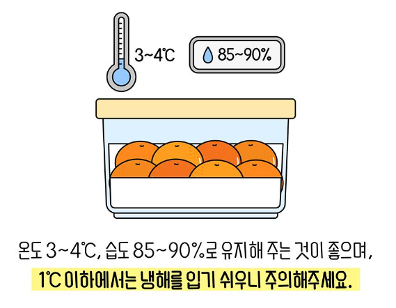 5.온도는 3~4°C, 습도는 85~90%로 유지하고, 온도가 1°C 이하로 떨어지면 냉해를 입을 수 있으므로 주의하세요.