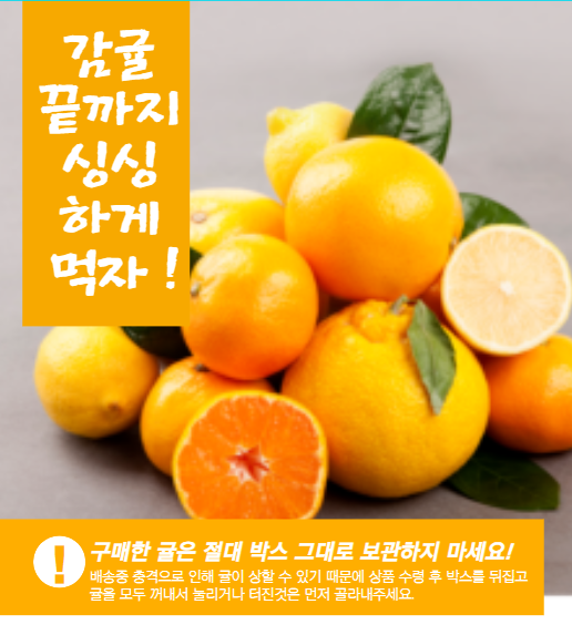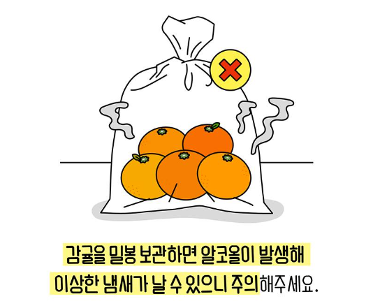 6. 감귤을 밀폐된 용기에 보관하거나 밀봉 보관시 알코올이 발생하여 이상한 냄새가 날 수 있으므로 보관 하지 말아 주세요.