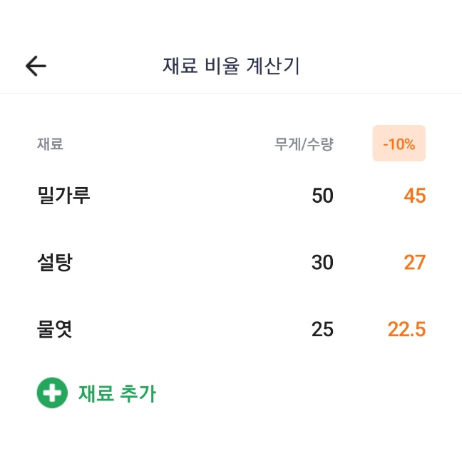 레시피 목록에 있는 재료 이름 그람을 입력하면 바로 적용이 됩니다.