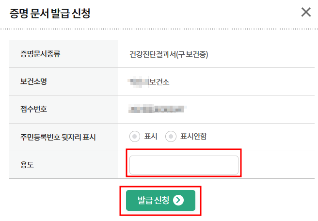 용도 작성후 발급 신청 하시면 건강진단 결과서가 확인 하실수 있습니다.