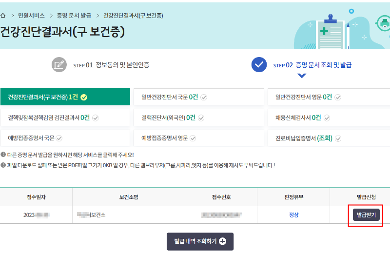 홈페이지 접속 > 증명서 문서 발급 클릭 > 본인인증 > 증명서 발급하기 > 건강진단서결과서 (구본건증) 발급받기
