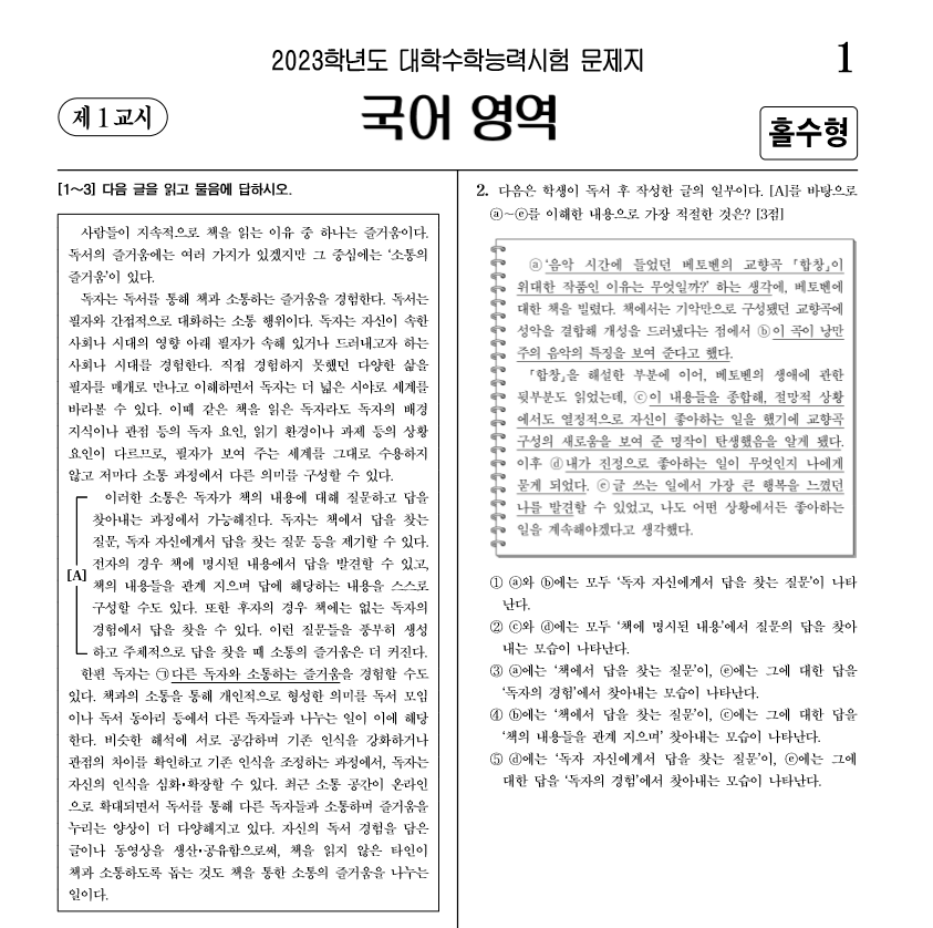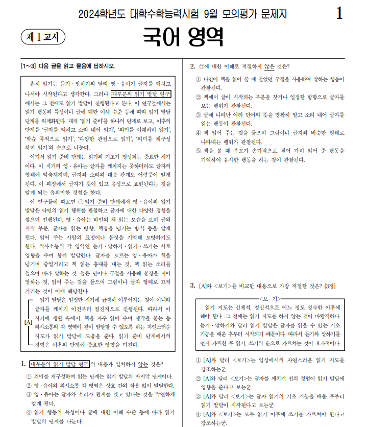 수능 모의고사 및 정답지 국어영역 예시 입니다.