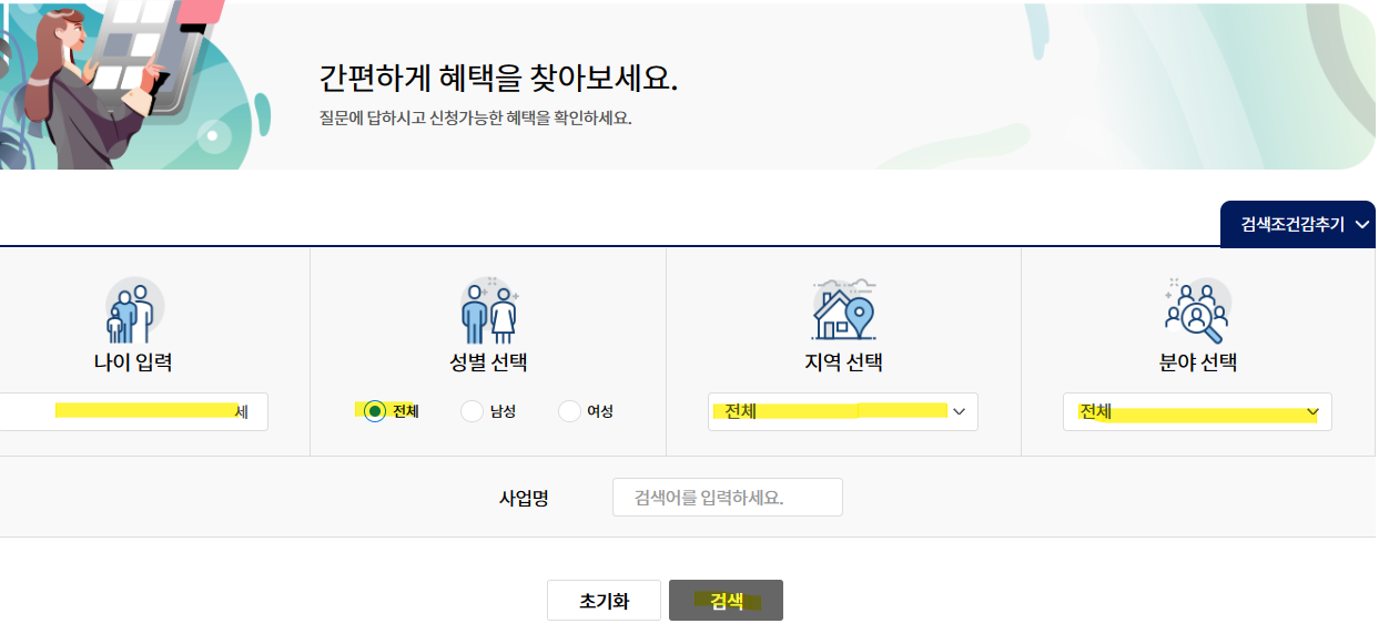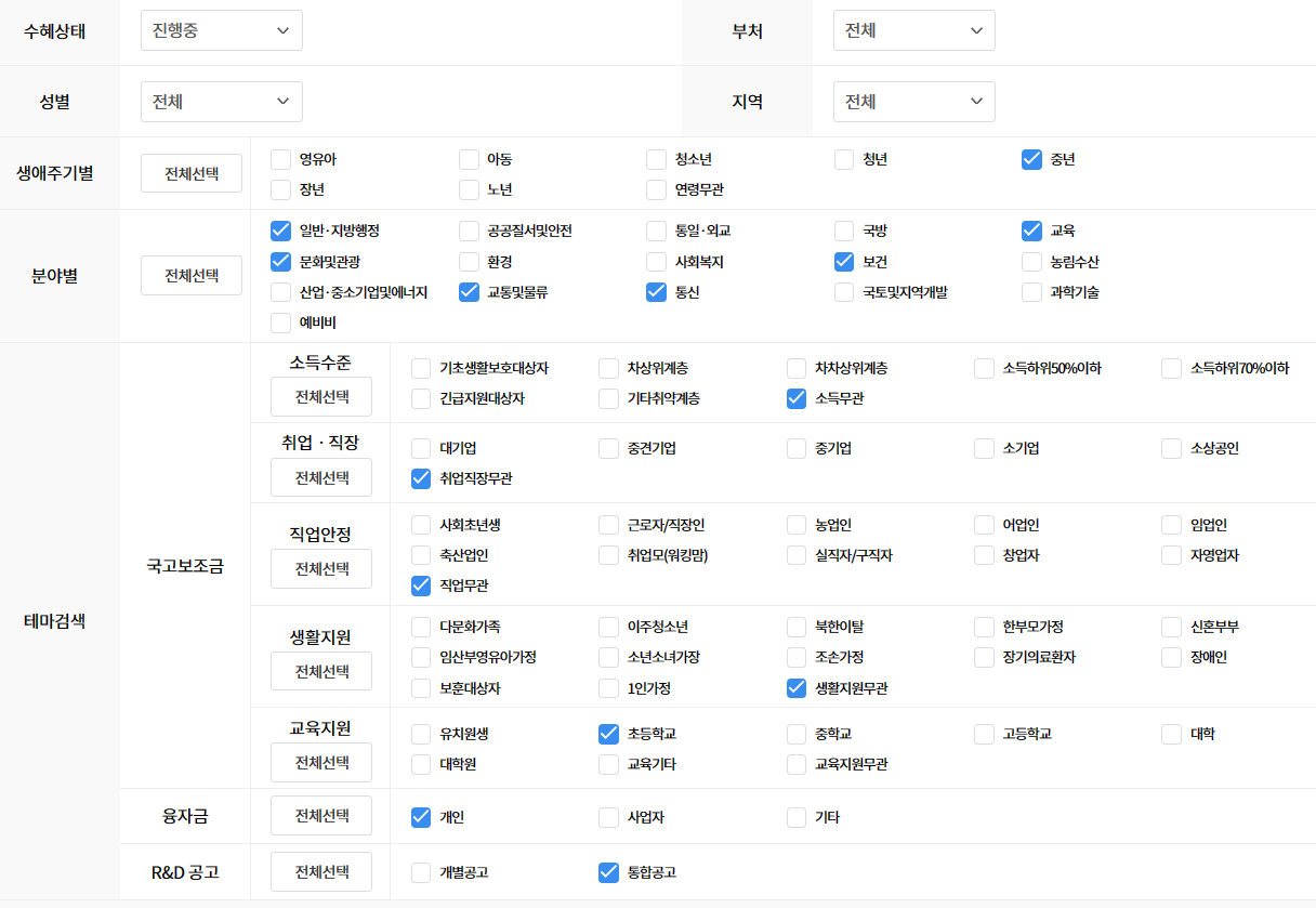 소득수준, 취업여부, 생활지원등 필요한 항목에 선택 후 확인 하셔서 검색