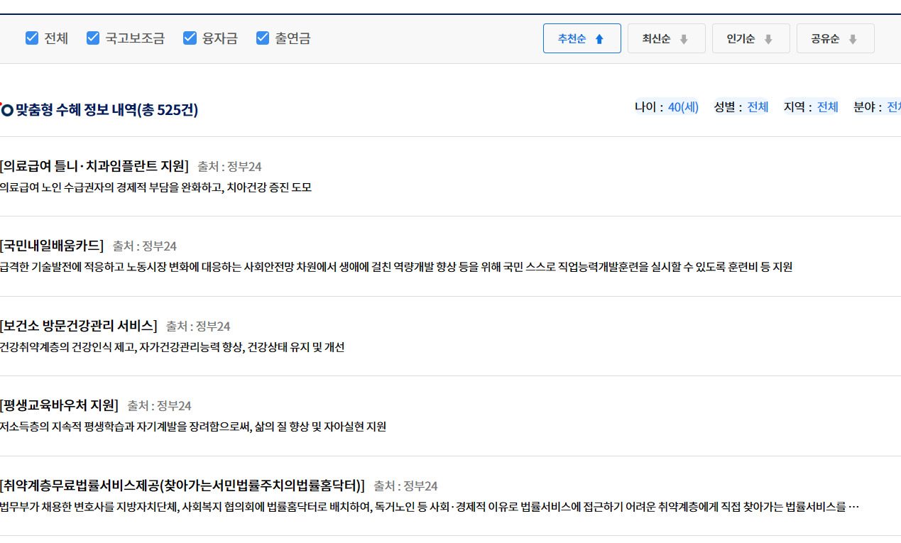 정부24, 복지로 나오지 않은 정부 지원금이나 법률서비스, 상해보험가입비 지원같은 지원금 혜택 까지 검색되는걸 알수 있습니다.