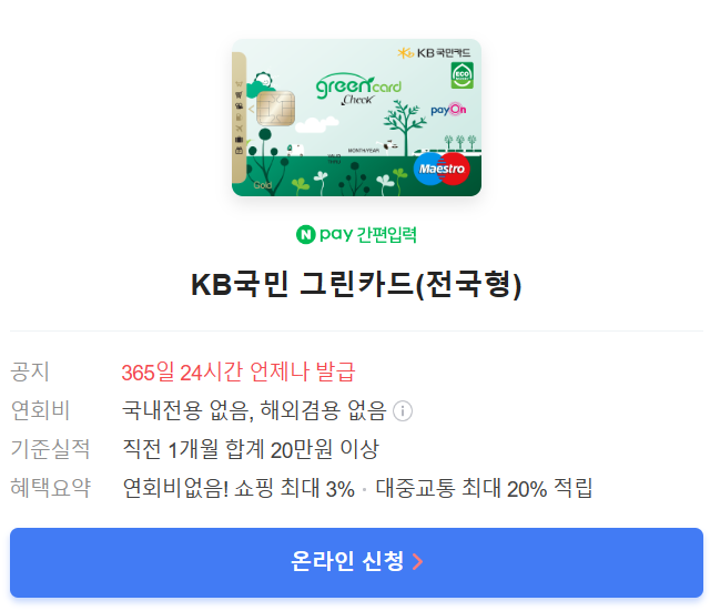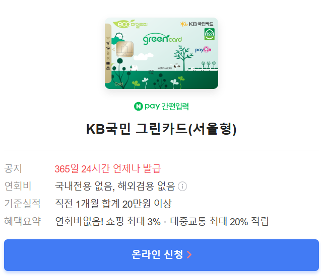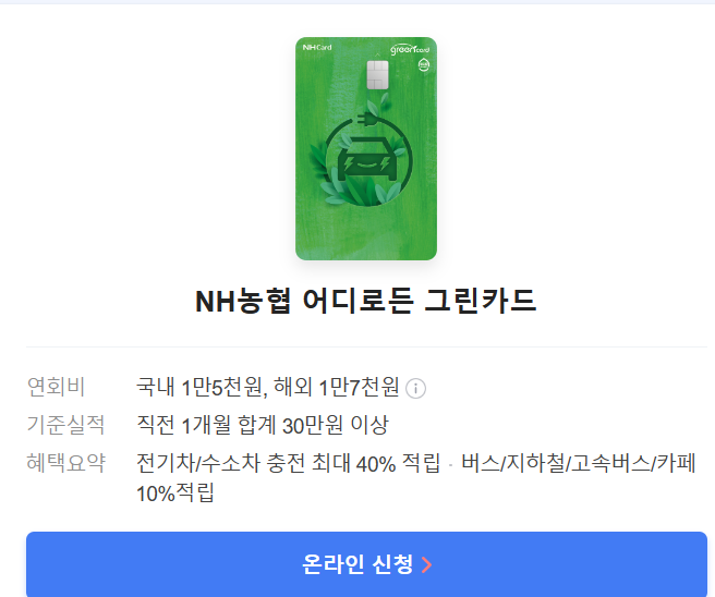 NH농협어디로그린카드, KB국민그린카드(서울형), KB국민그린카드(전국형) , IBK국민행복카드 등