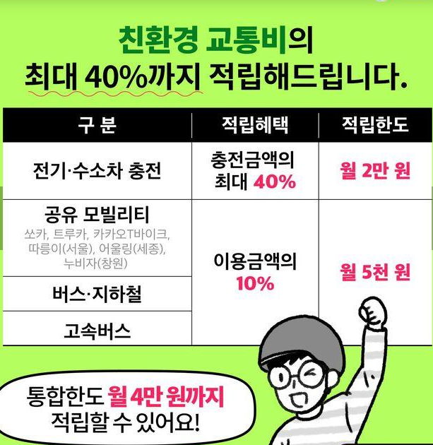 대중교통이용, 전기차, 수소차 등을 이용하여 탄소중립 실천하면 월최대 4만원을 돌려 받을 수 있는 카드 입니다.