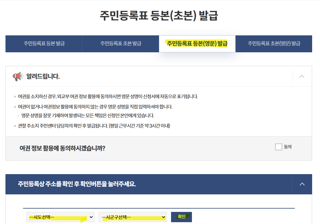 첫번째 방법 여권 영문 이름만 확인 하시는 경우는 주민등록등본(영문) 발급으로 확인 가능하며