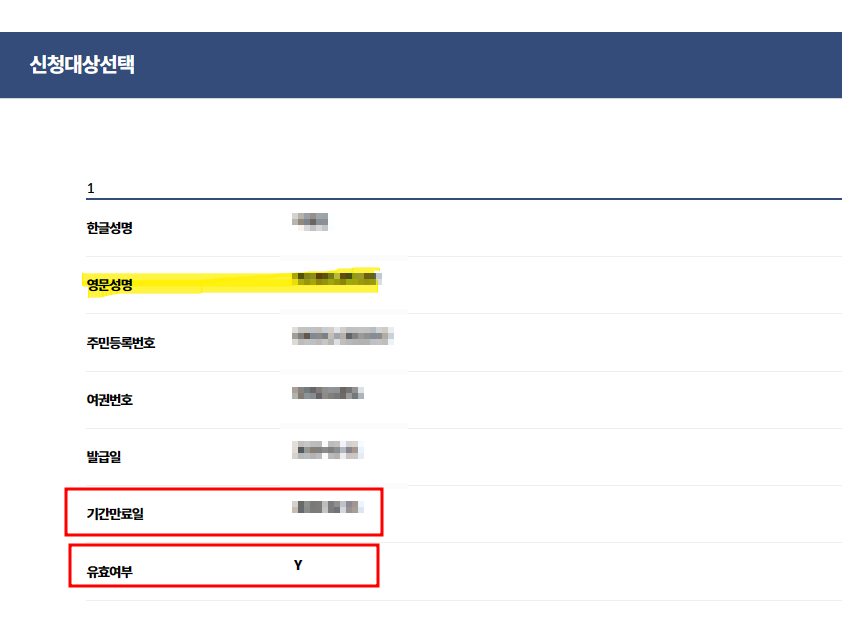 영문 이름 및 여권발급일 기간만료일 유효 여부 알 수 있습니다.
