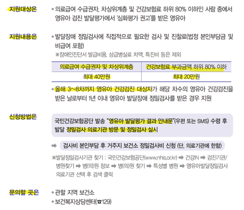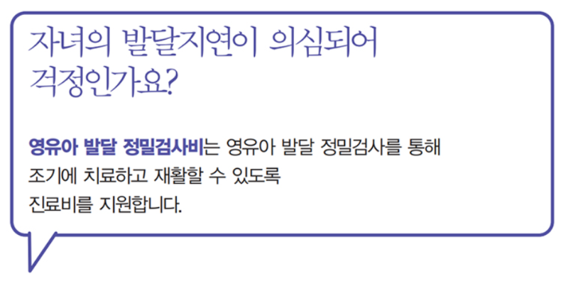 영유아 발달 정밀검사비는 영유아 발달 정밀검사를 통해 조기에 치료하고 재활 할수 있도록 진료비를 지원합니다.