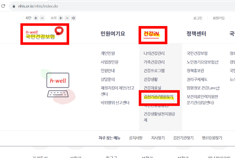 국민건강보험공단 > 건강인 > 검진기관 / 병원찾기 > 병원정보 > 병원 찾기 > 시도선택 > 시군구선택 > 검색 하시면 뜹니다