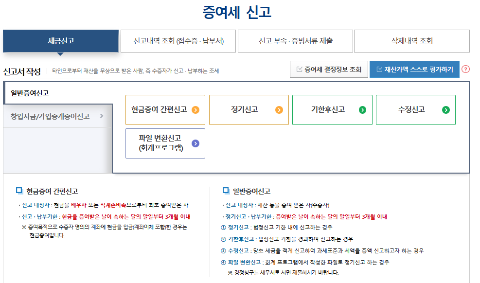 세금신고 > 증여세 신고 > 일반증여 신고 > 항목을 선택 하시면 됩니다.