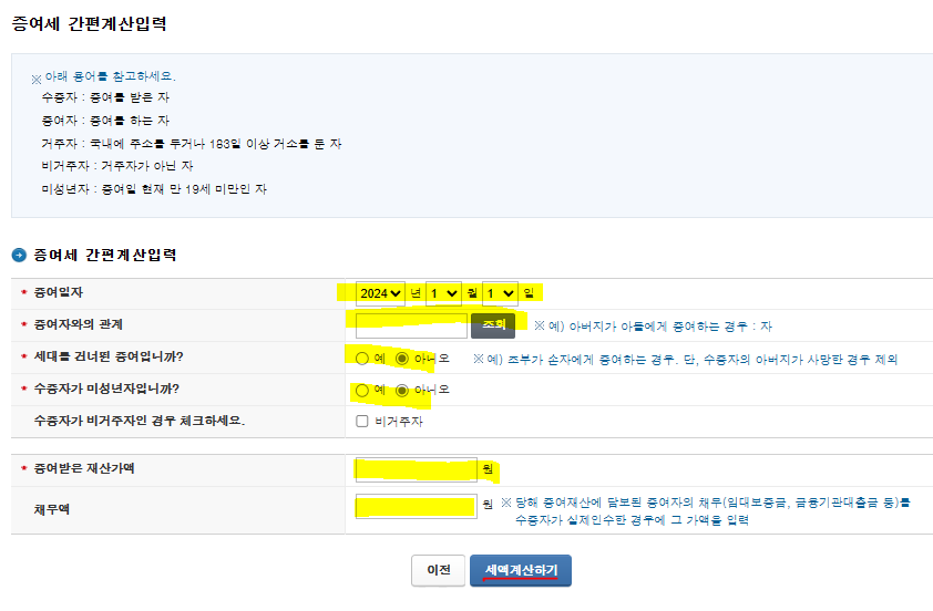 수증자( 재산을 받는자) : 증여자 관계 등 선택 하셔서 작성 하시면 됩니다.