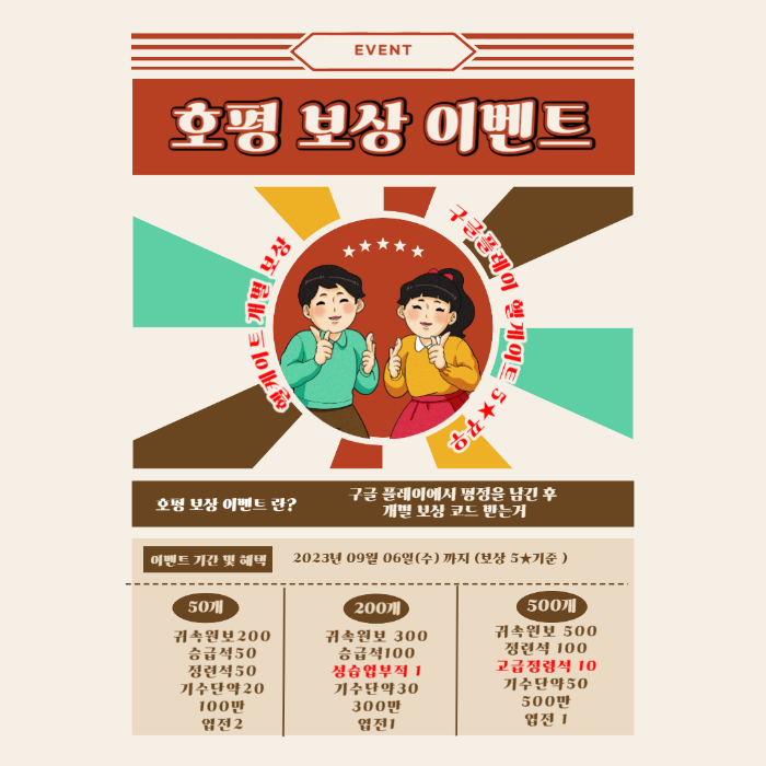 5★ 리뷰 수가 200개에 도달(귀속원보*300, 승급석*100,성급업 보호 부적*1, 기수 단약*30, 300만 엽전*1)5★ 리뷰 수가 500개에 도달 (귀속원보*500, 정련석*100, 고급 정련석*10,기수 단약*50,500만 엽전*1)