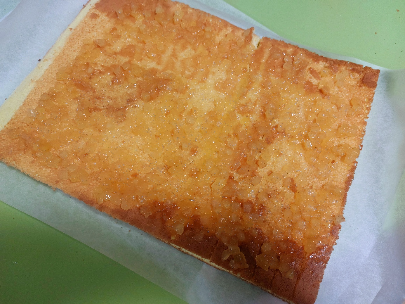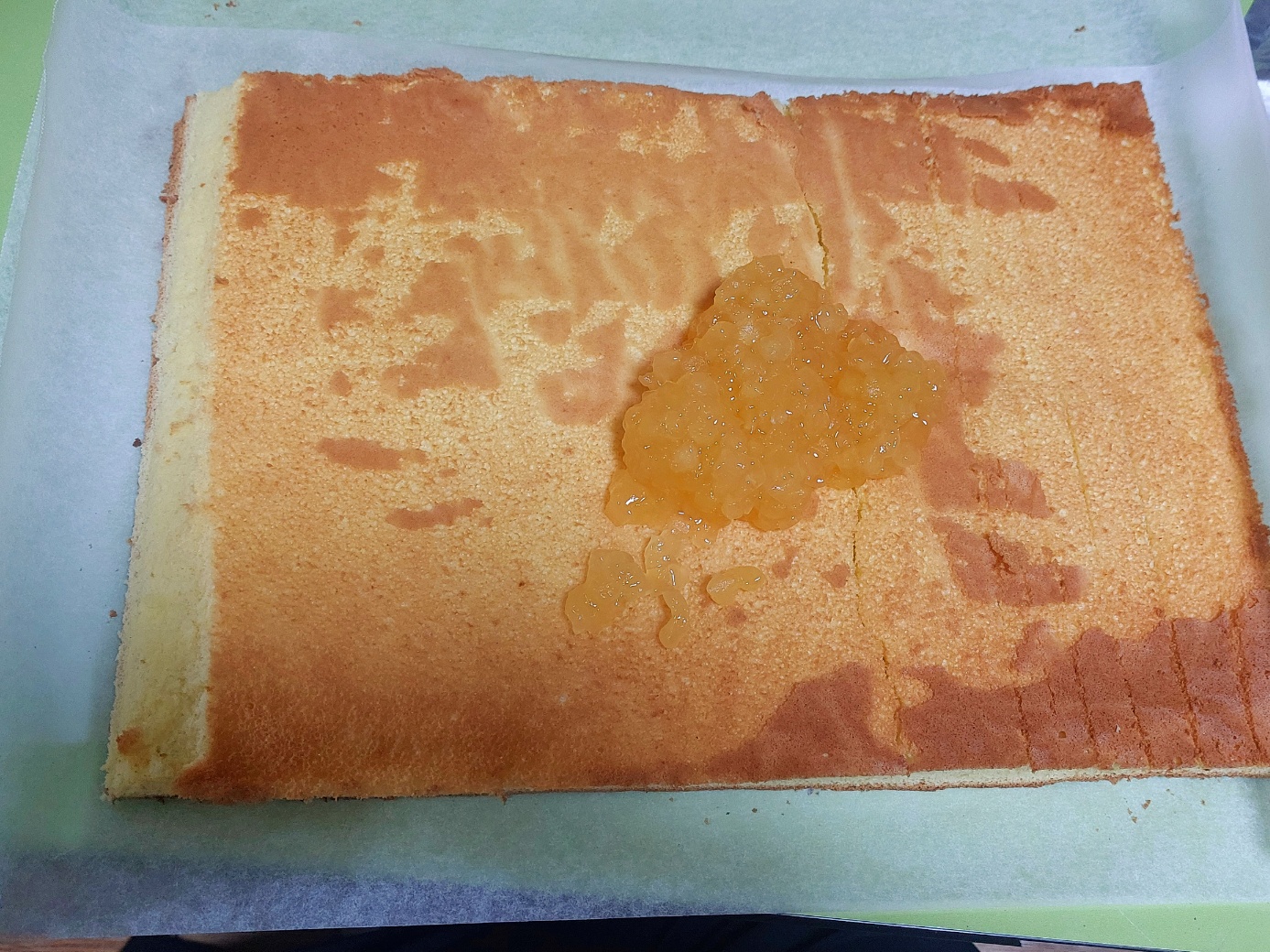 꼼꼼하게 끝부분 까지 발라 주셔야 접착제 역활을 하기 때문에 롤케이크가 풀어지지 않습니다.