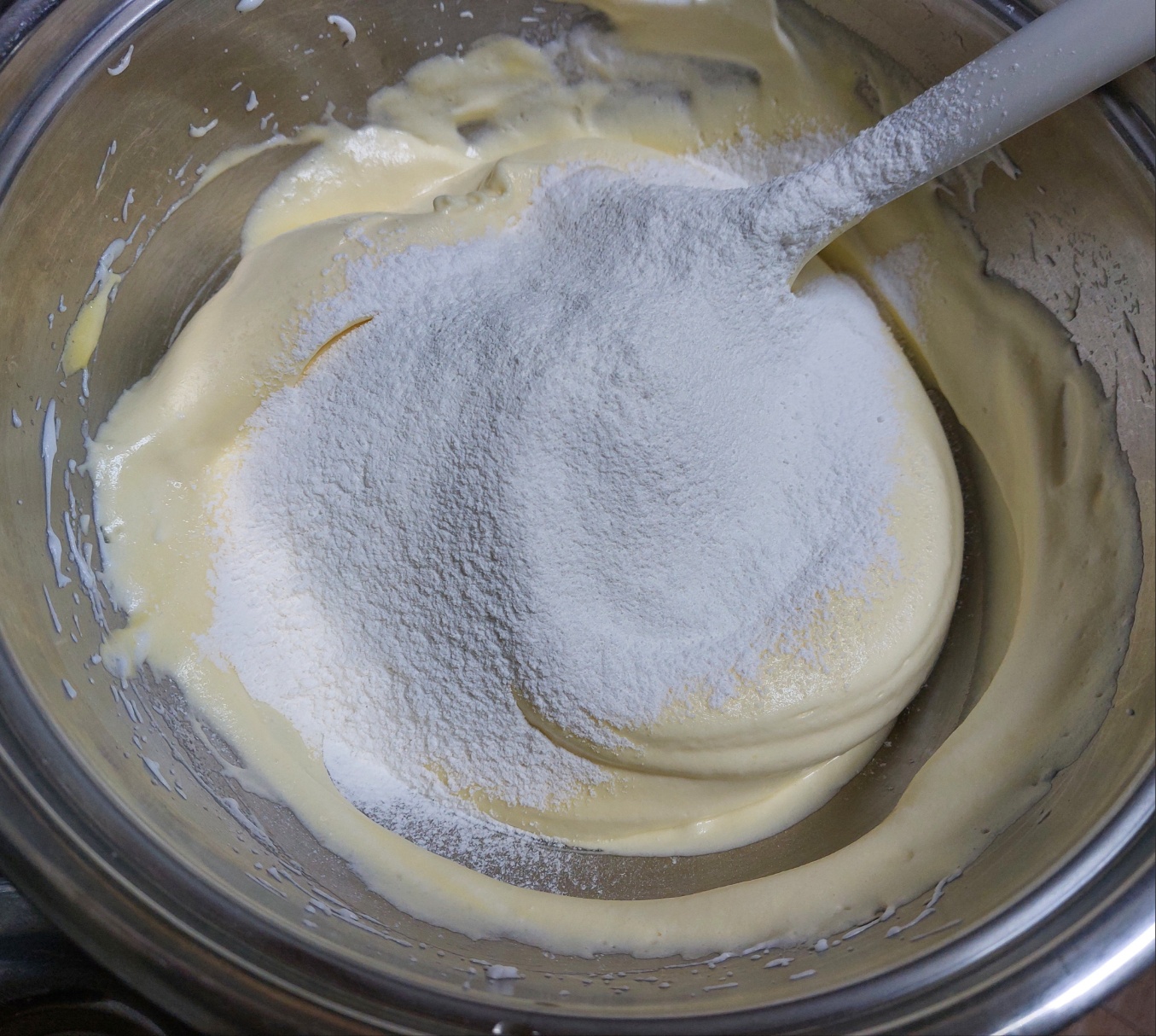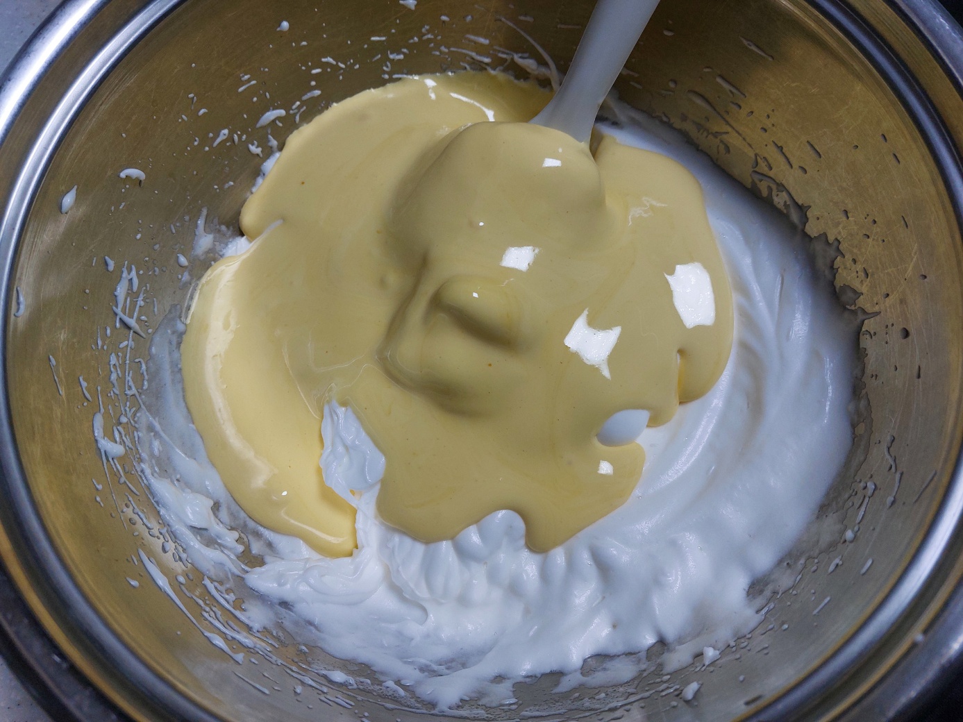 노른자반죽을 머랭에 한번에 넣어 가볍게 섞어 주세요