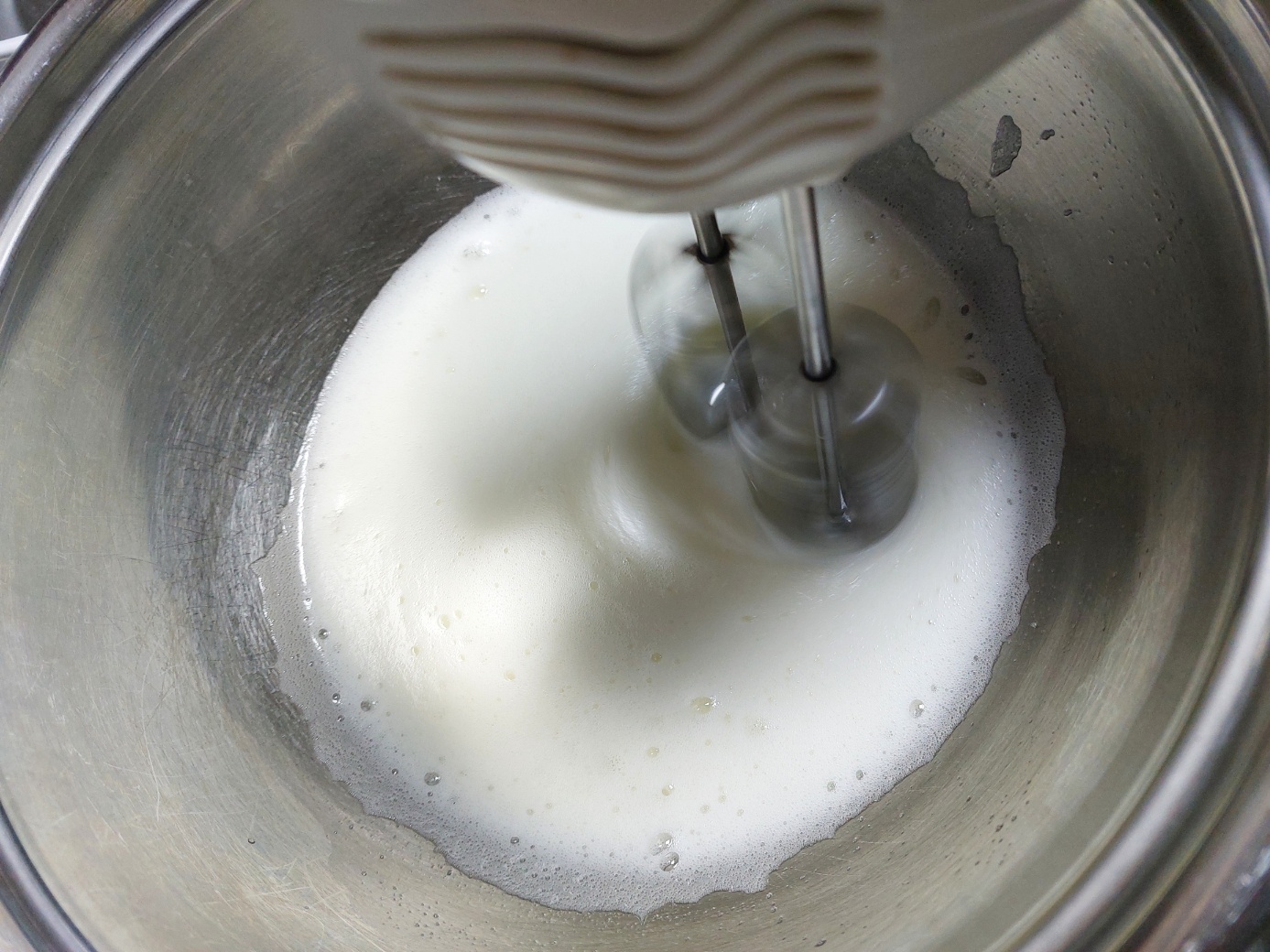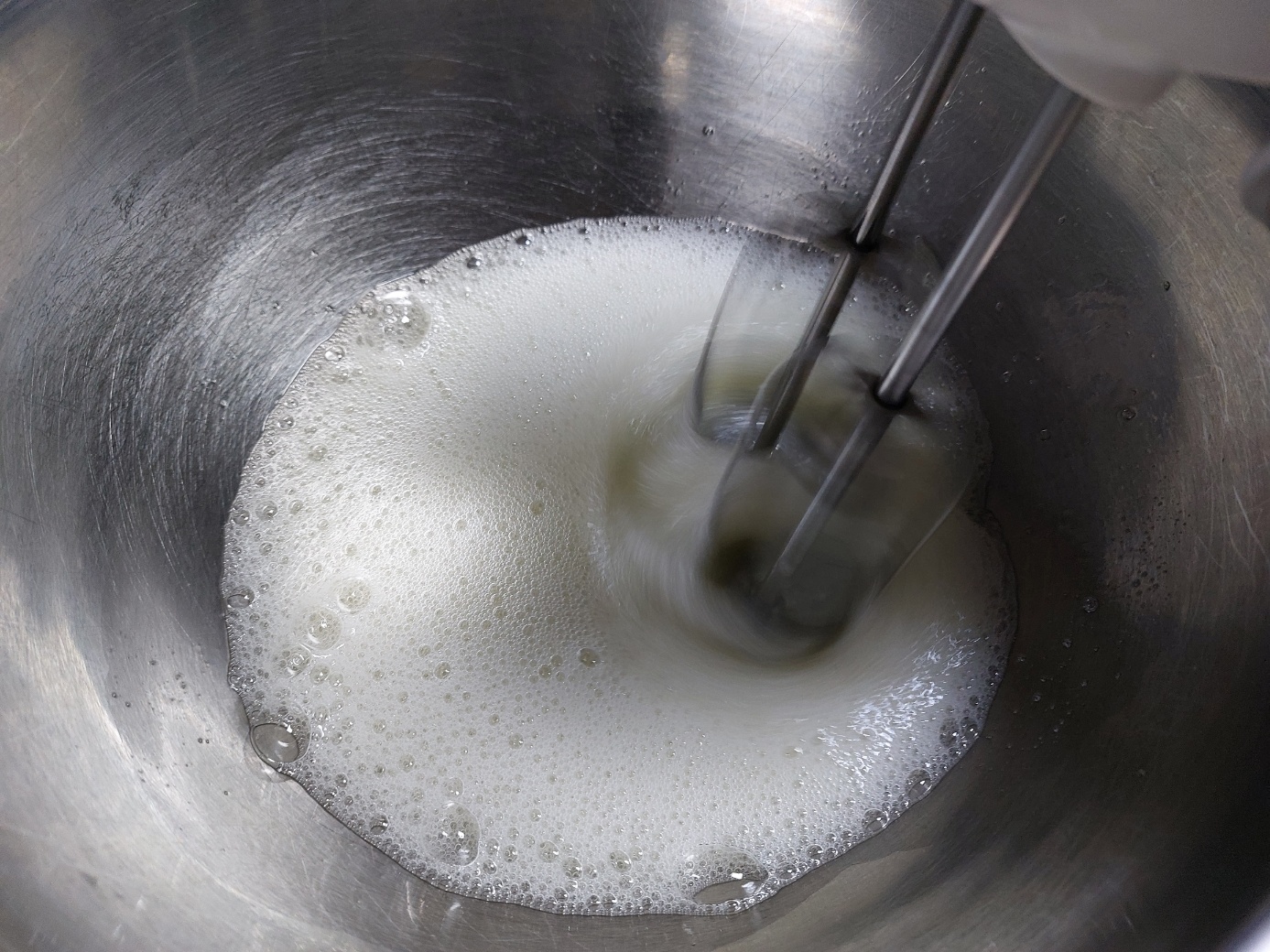 설탕b를 3회 나눠 넣고 뿔이서는 머랭을 만들어 주세요