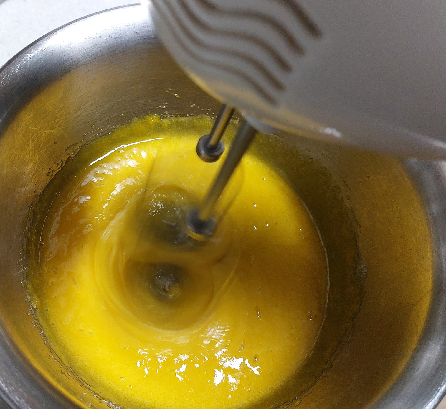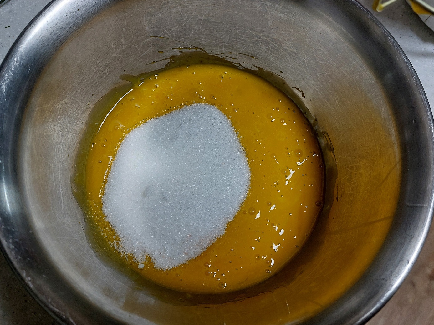 노른자와 설탕이 만나면 덩어리지니 설탕넣고 한번 섞은 후 휘핑 해 주시면 됩니다.